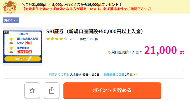 SBI証券を新規口座開設+50,000円以上入金するだけで、21,000ポイントももらえるんだね!