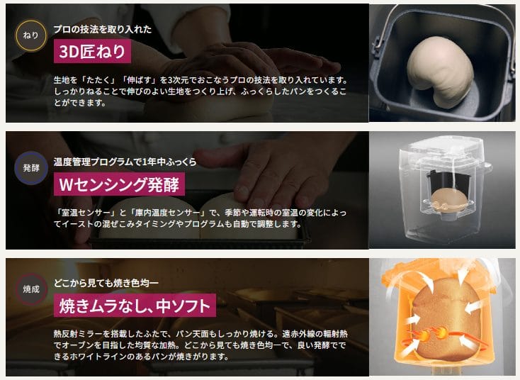 プロの技法を取り入れた独自技術「3D匠ねり」と「Wセンシング発酵」で、一年中おまかせでふっくらおいしいパンが出来上がります。