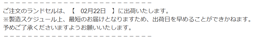 SNSの投稿を見ても、ランドセルを早く購入すると早めに届く人が多く、遅ければ3月頃の発送になってしまうようです。